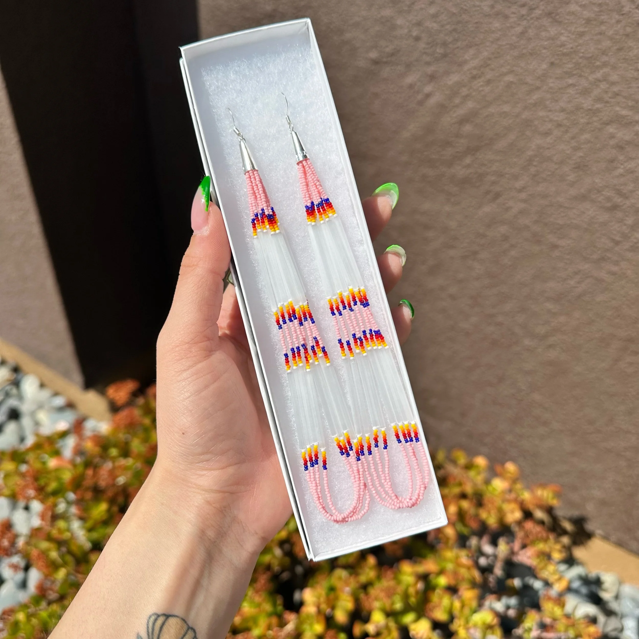 Long dangles with baby pink, AB royal blue & fire colored beads. Accented with opal bugle beads. Finished with silver plated hardware.