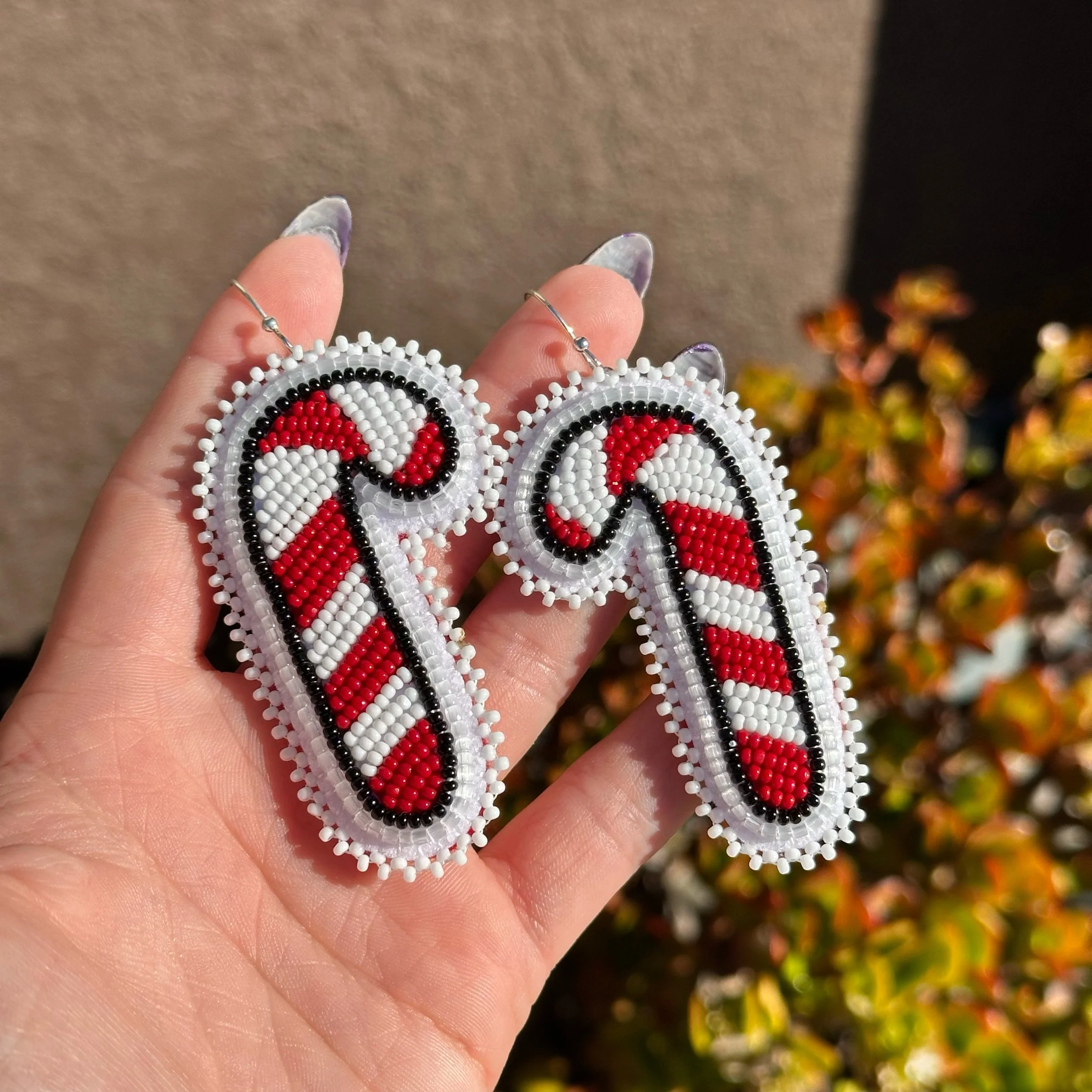 Candy cane shaped earrings with black, red & white charlotte cut beads. Accented with opal tri-cut beads. Backed with felt and silver plated earring hooks.