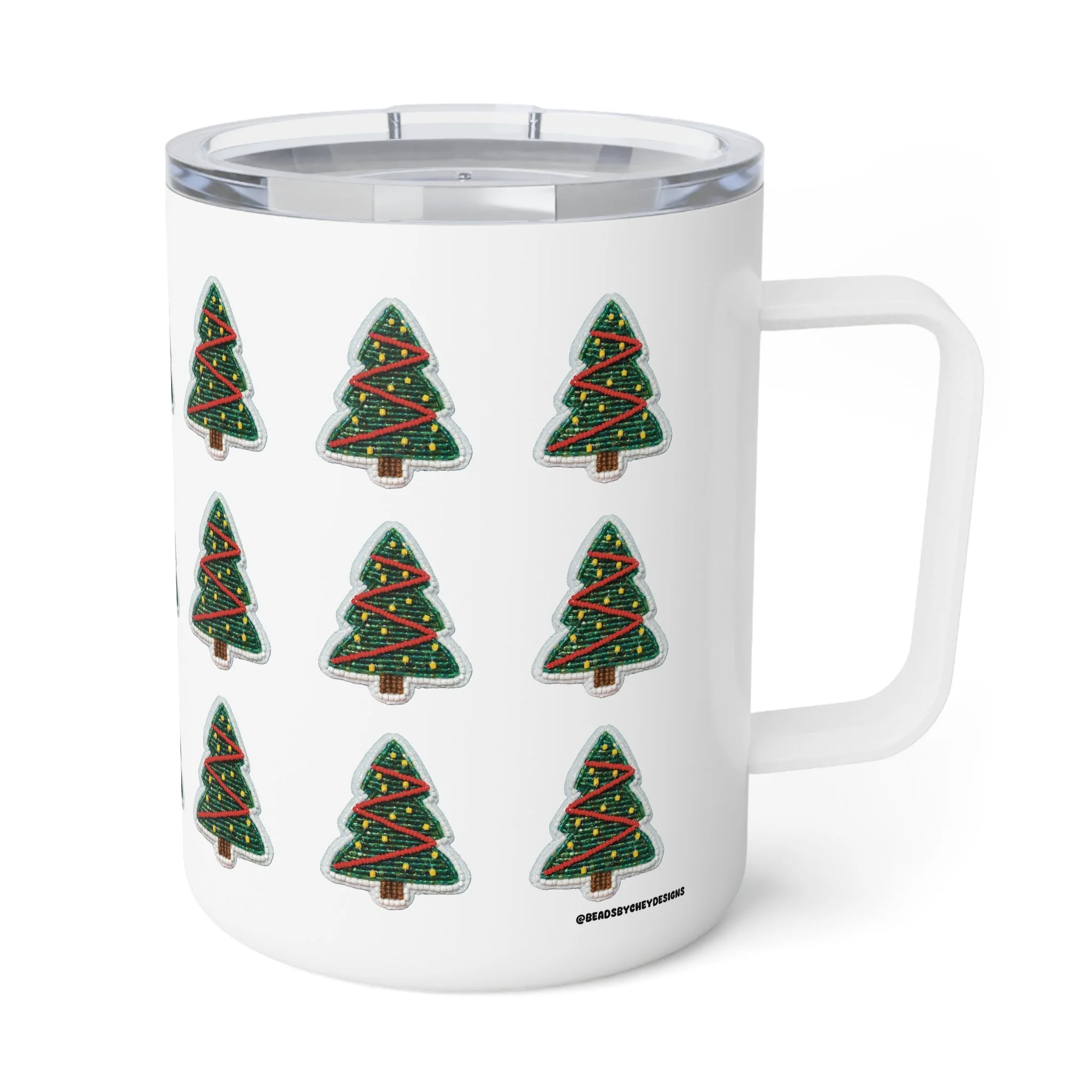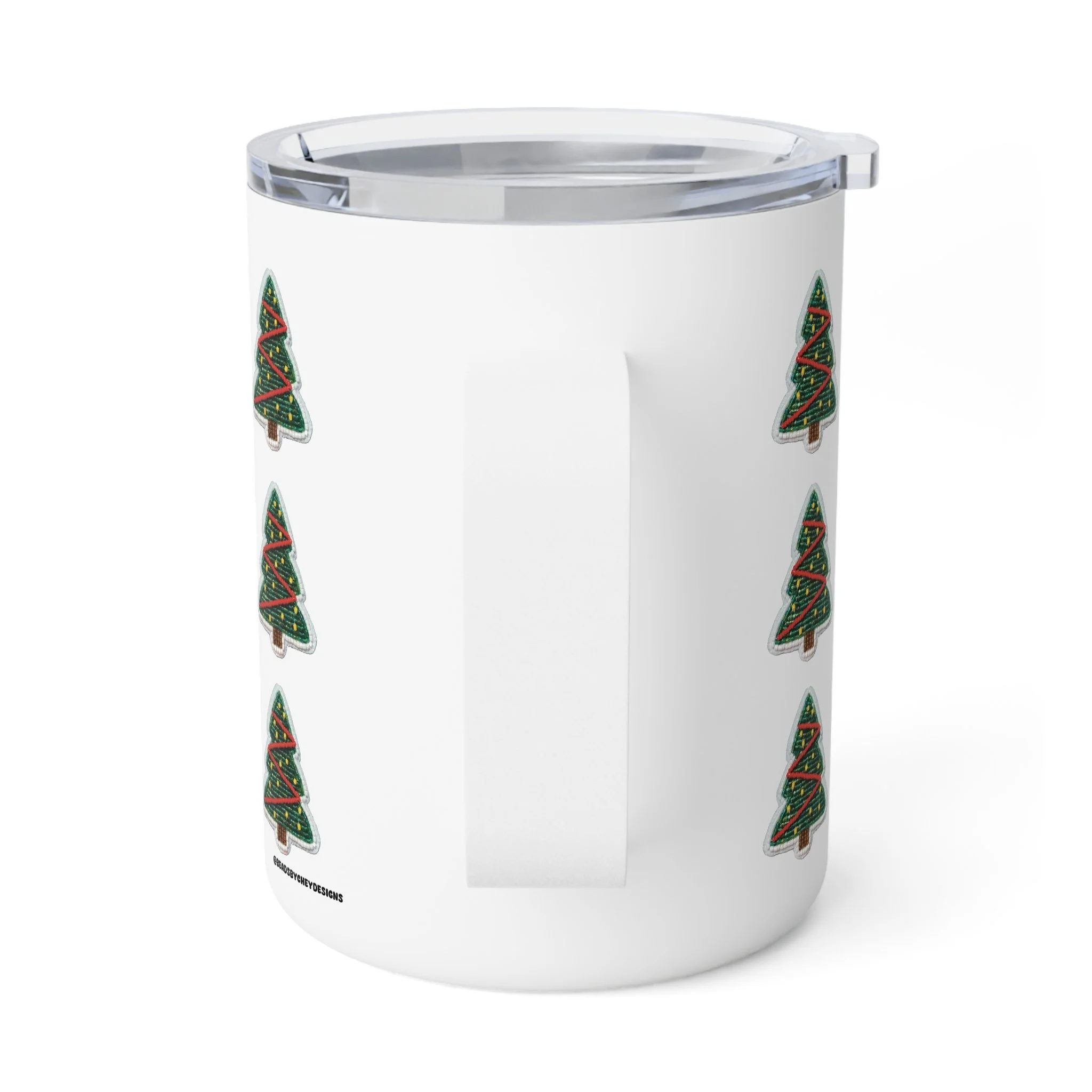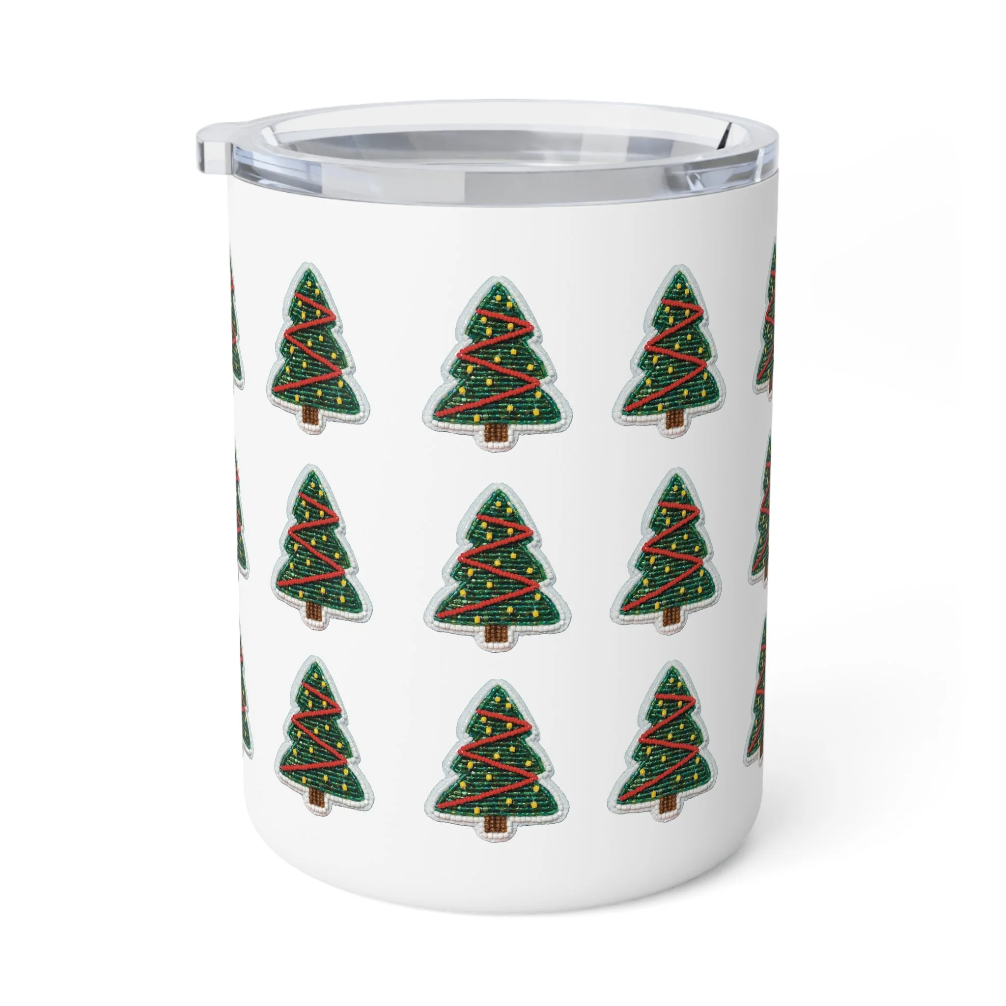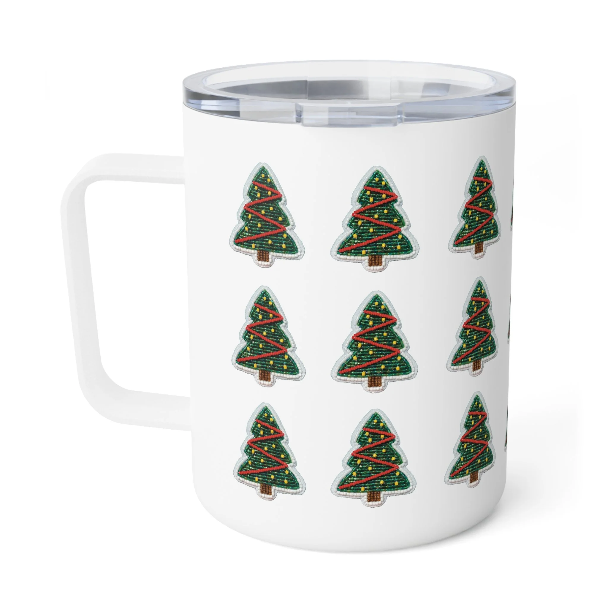 Sip winter mornings with a cheerful, compact companion. This 10oz insulated coffee mug keeps drinks warm while its glossy, wraparound print of hand-drawn Christmas trees adds a playful holiday rhythm to your desk, kitchen, or car cup holder. The clear push-on acrylic lid lets you check your pour at a glance and helps prevent spills when you’re rushing out the door. It feels sturdy in hand thanks to stainless steel construction and a subtle stipple texture under the high-gloss finish. Lightweight and lead/BPA-free, it’s a small, festive vessel that brightens quiet routines and seasonal gatherings.