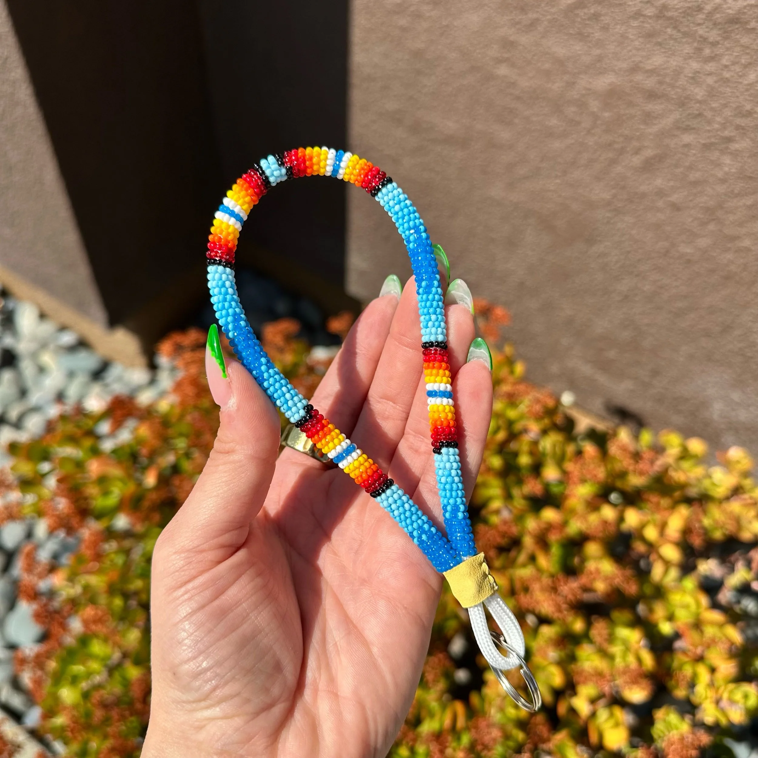Image 1 of 1 Blue Flame Mini Keychain $45.00 Sold Out! Mini sized keychain with blue ombre & fire colored beads. Finished with buckskin & silver keyring. Sold Out! Added! Mini sized keychain with blue ombre & fire colored beads. Finished with buckskin & silver keyring.