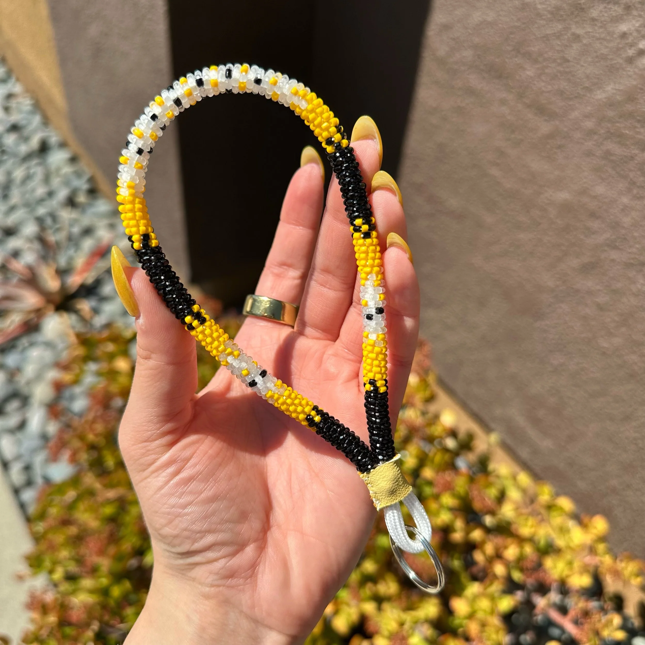 Image 1 of 1 Bumble Bee Mini Keychain $45.00 Mini sized keychain with black, yellow & satin beads. Finished with buckskin & silver keyring. Add To Cart Added! Mini sized keychain with black, yellow & satin beads. Finished with buckskin & silver keyring. Hello Kitty Beaded Earrings $45.00 Add Added! Neapolitan Mini Keychain $45.00 Add Added! Baby Pink Dangles $68.00 Add Added!
