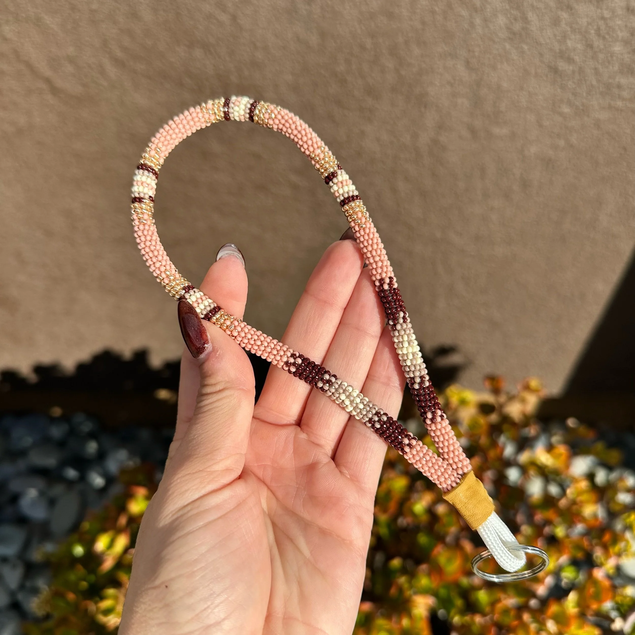 Image 1 of 1 Cheyenne Pink Keychain $50.00 Regular sized keychain with brown, mocha, cream & champagne luster beads. Finished with buckskin & silver keyring. Add To Cart Added! Regular sized keychain with brown, mocha, cream & champagne luster beads. Finished with buckskin & silver keyring.
