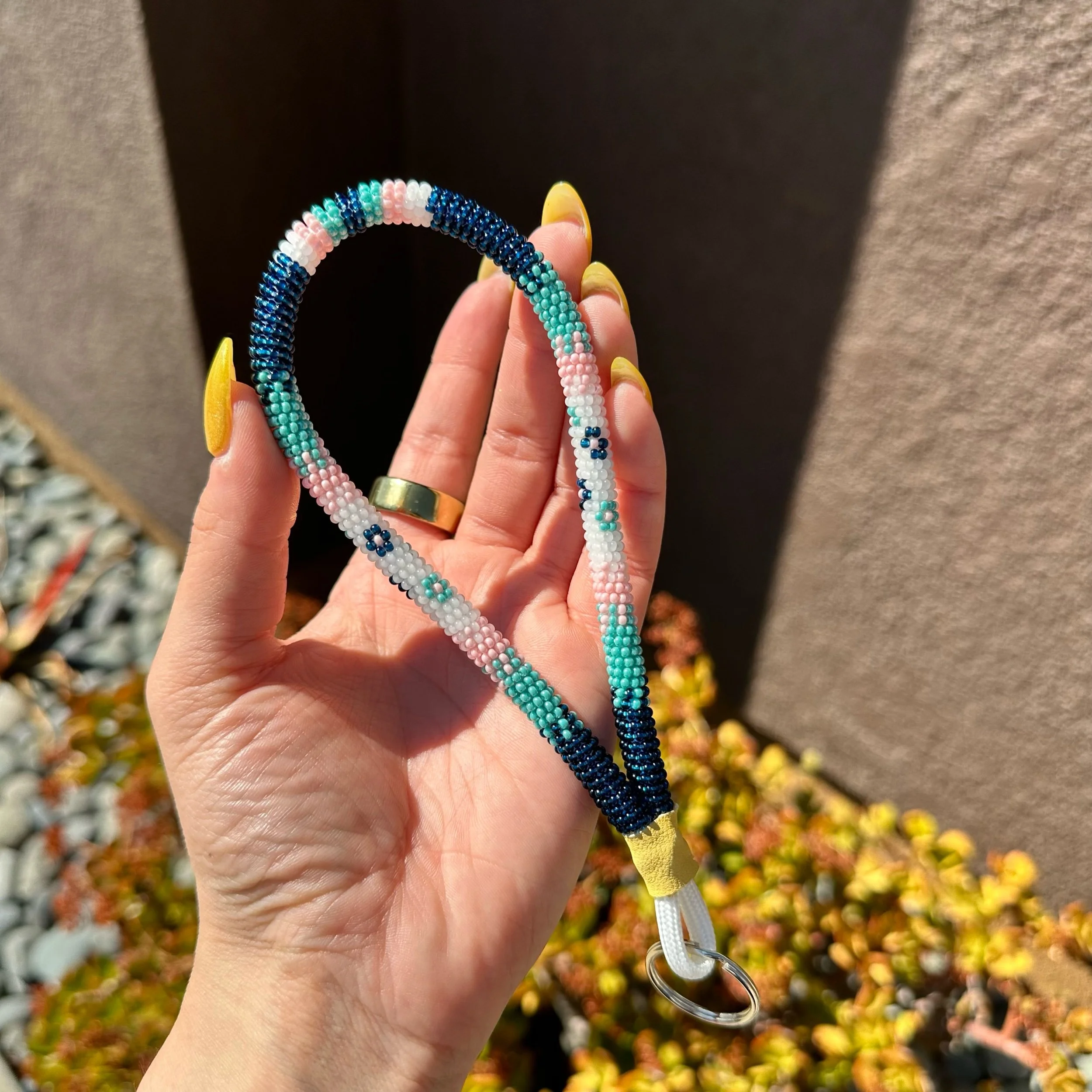 Mini sized keychain with Montana blue, turquoise luster, baby pink luster & opal beads. Accented with Montana blue & turquoise luster flowers. Finished with buckskin & silver keyring.