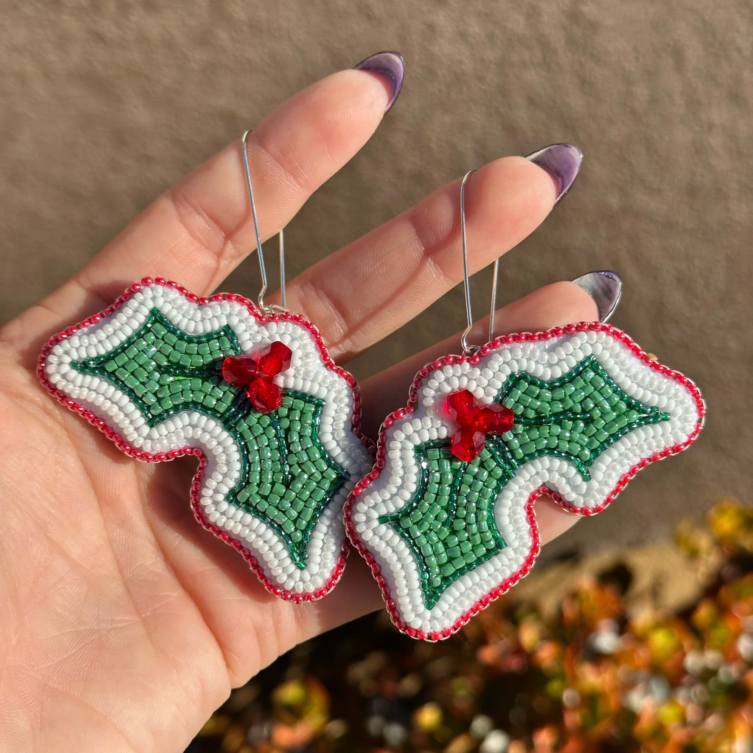 Mistletoe shaped earrings with luster green, white, white luster & red luster beads. The berries are made with red fire polish beads. Backed with felt and silver plated earring hooks.