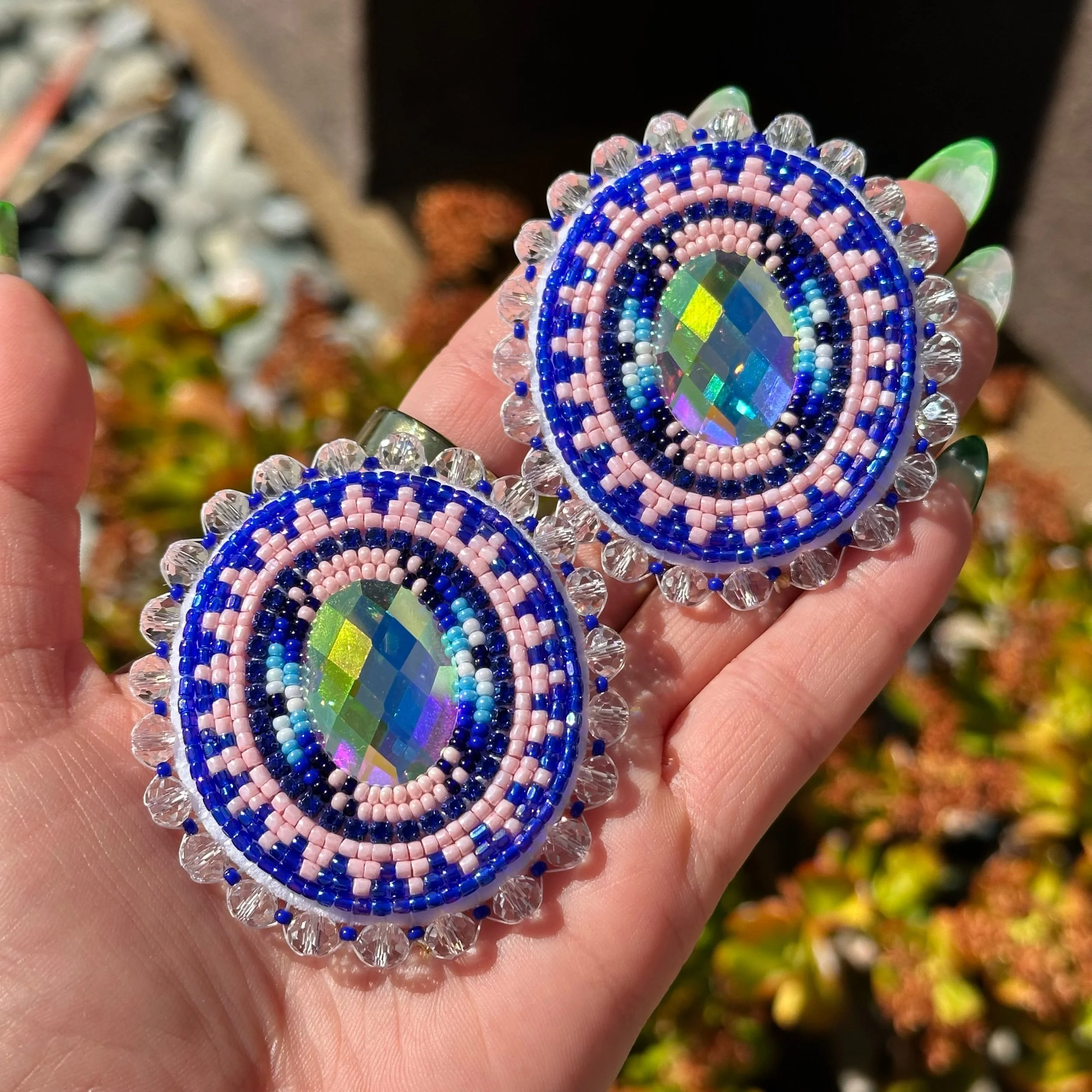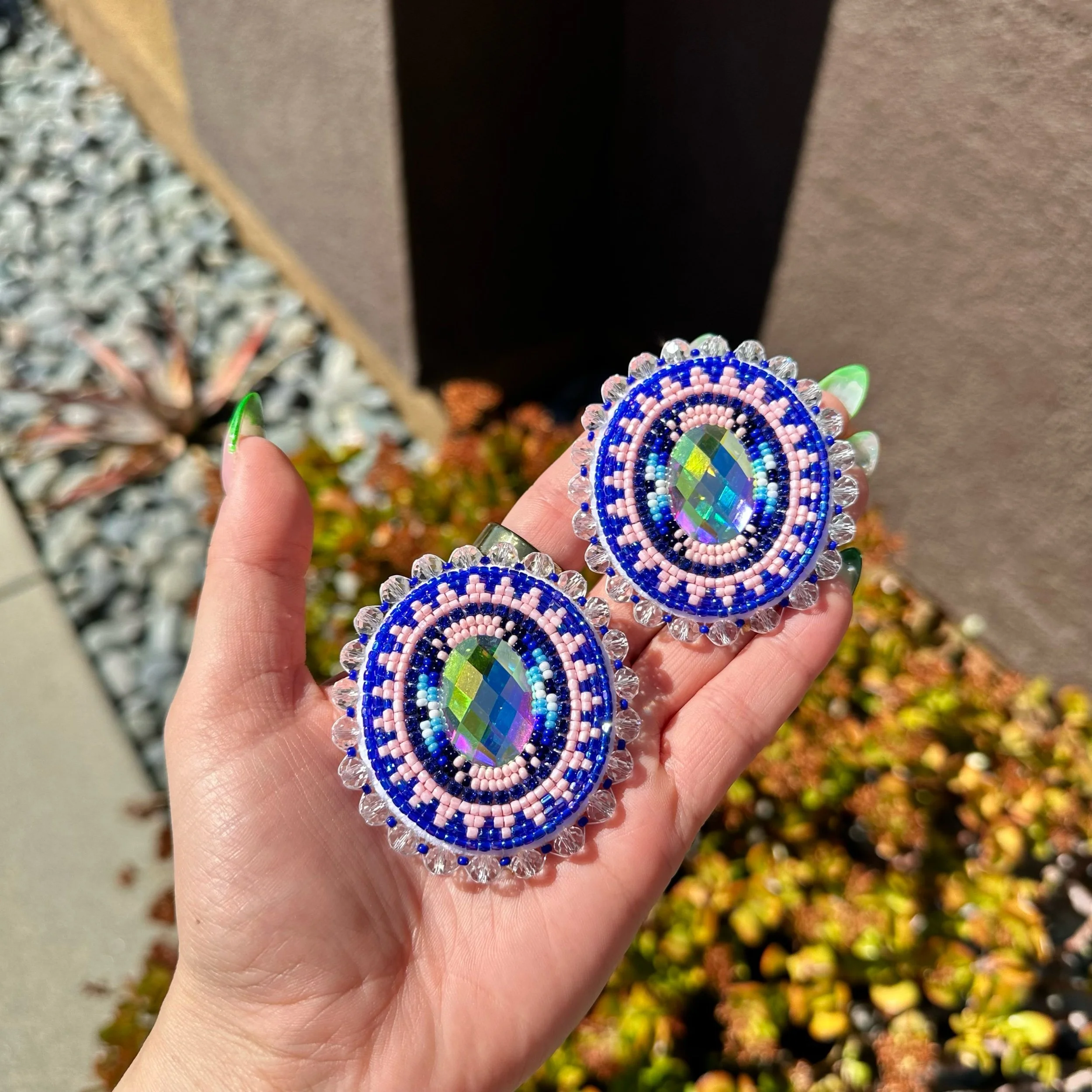 AB rhinestone oval centers with white, light blue, royal blue, navy blue & baby pink beads. Accented with royal blue rhinestone banding. Backed with felt and silver plated fingernail posts.
