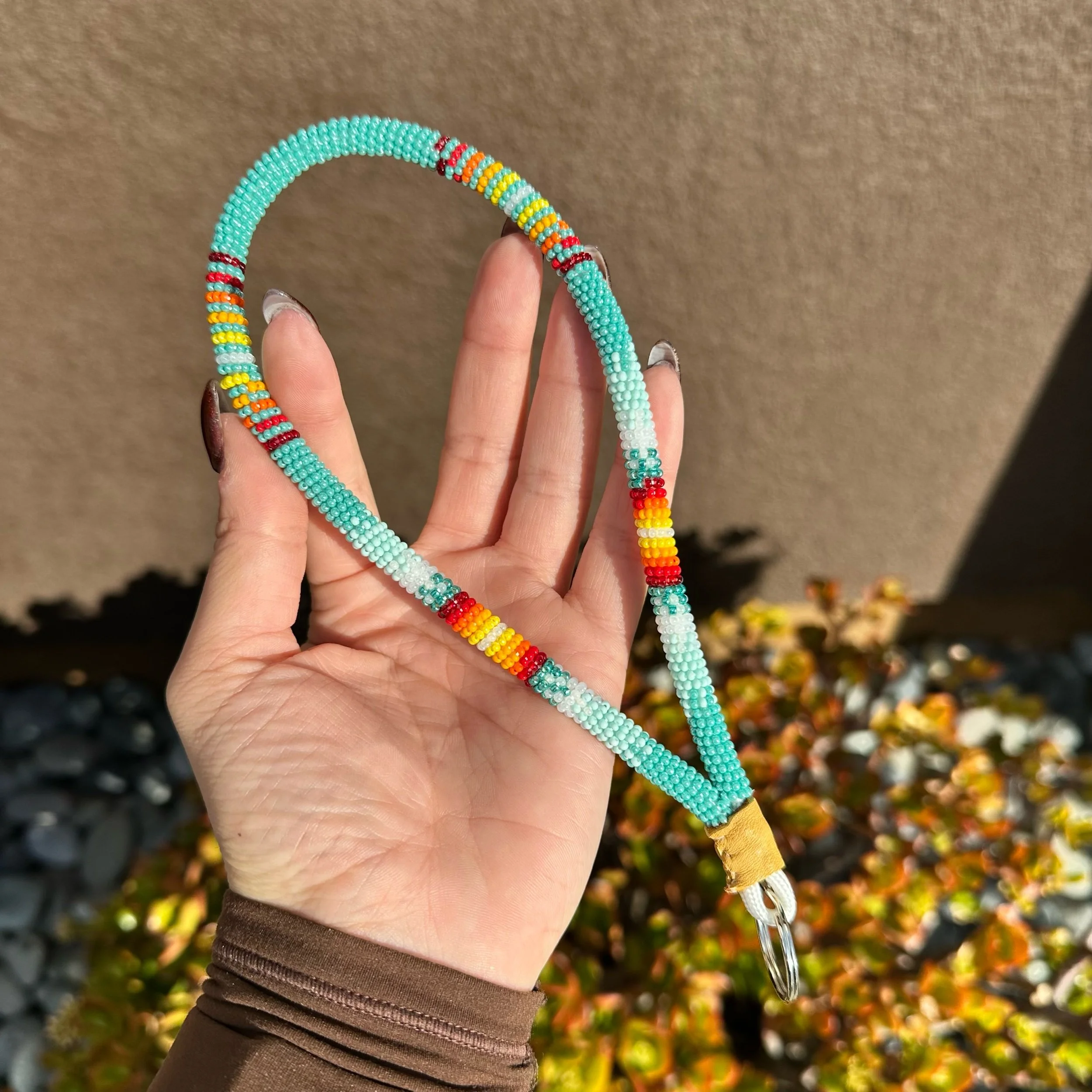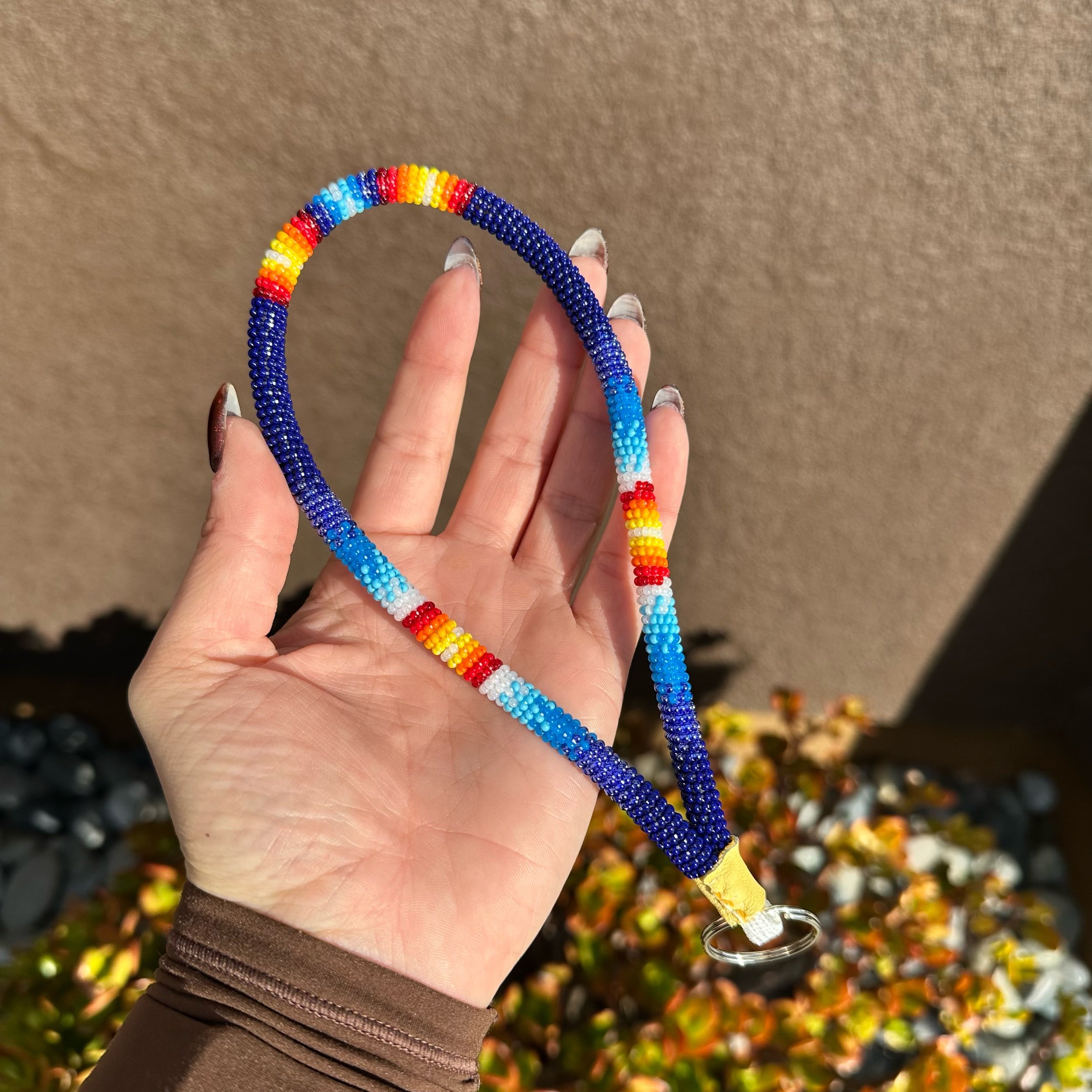 Regular sized keychain with navy blue, cobalt luster, opal blue, sky blue, white luster & fire colored beads. Finished with buckskin & silver keyring.