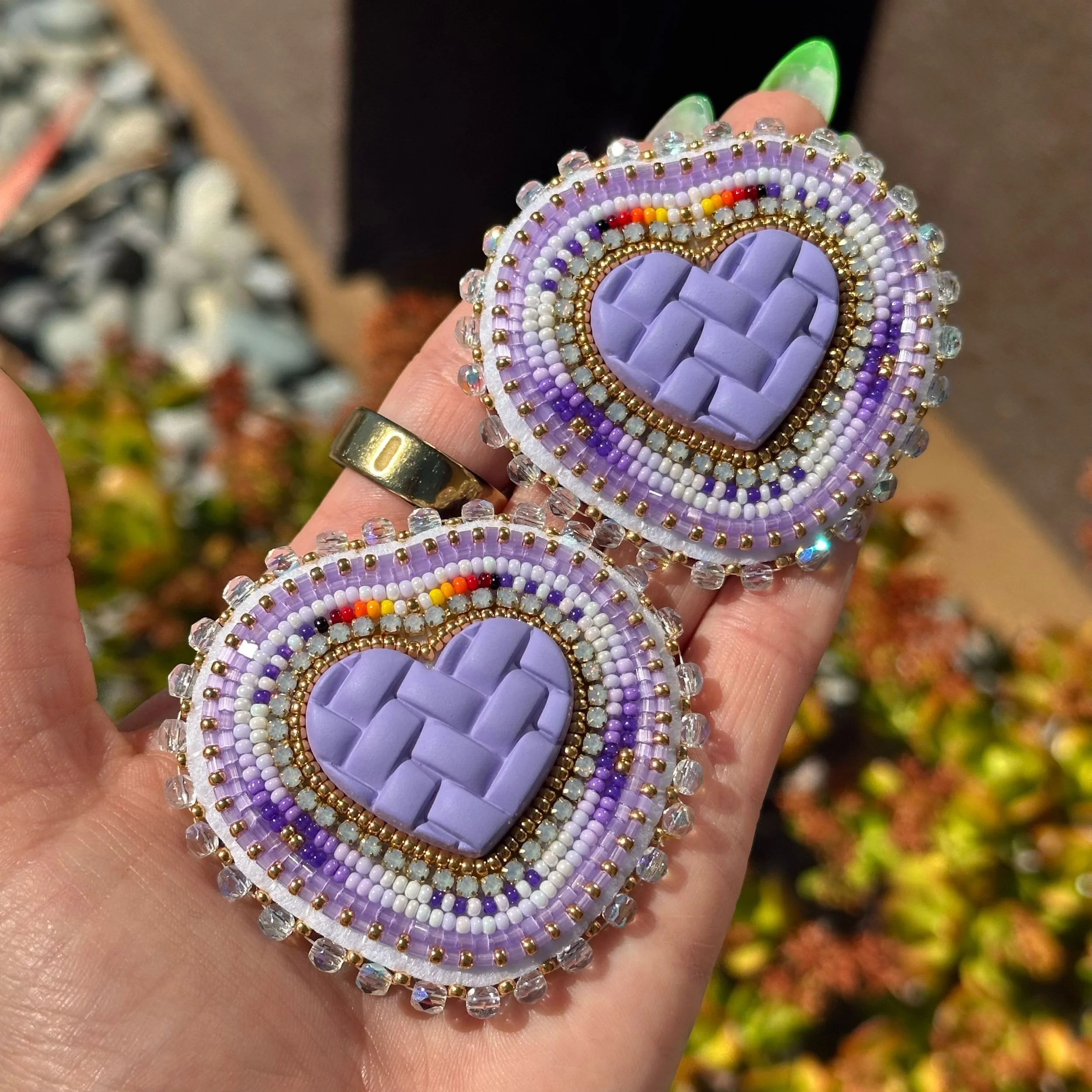 Purple woven heart centers with gold, luster white & purple ombre beads. Accented with gold opal rhinestone chain. Backed with felt and gold plated fingernail posts.