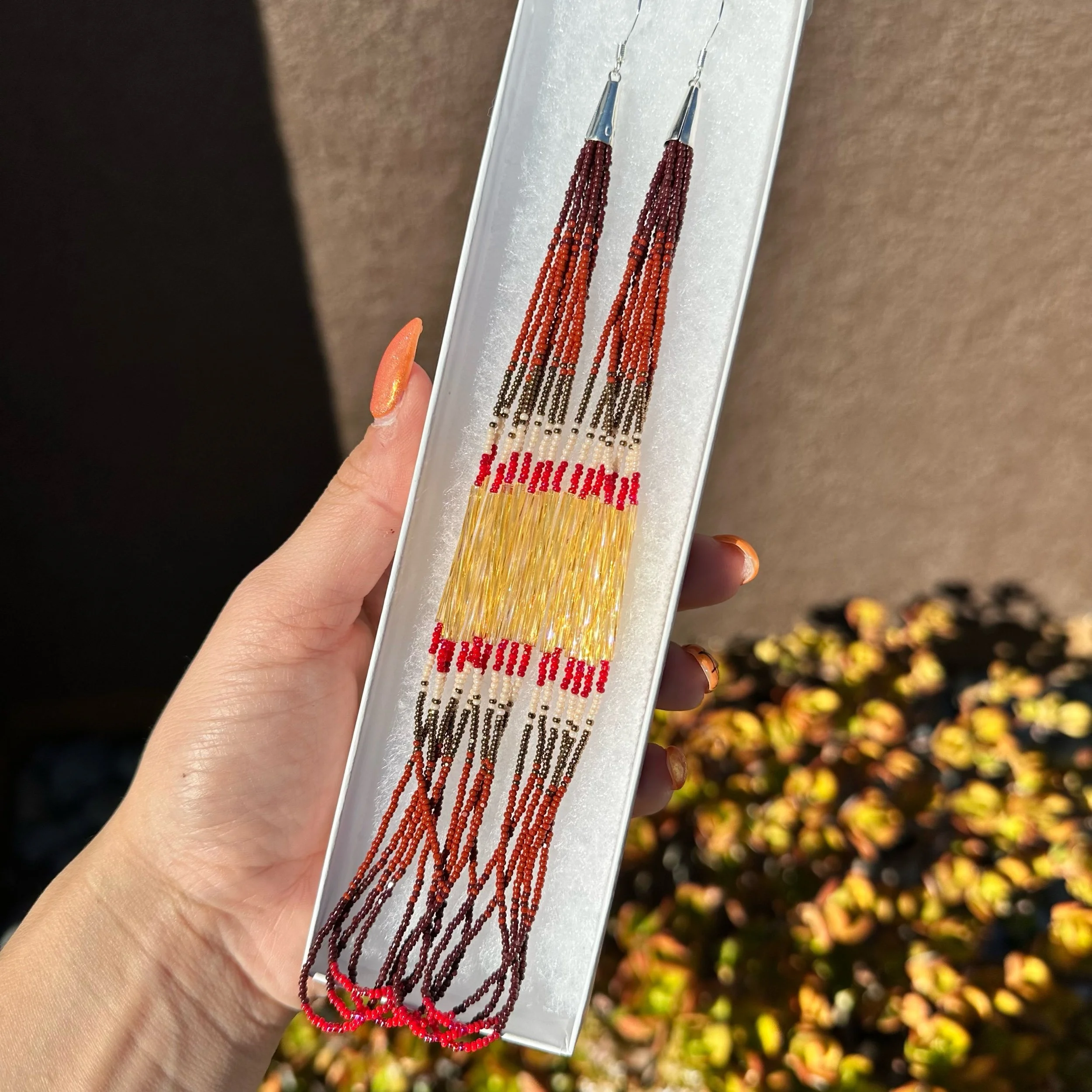 Long dangles with ombre brown, bronze, eggshell & red ombre beads. Accented with gold bugle beads. Finished with silver plated hardware.