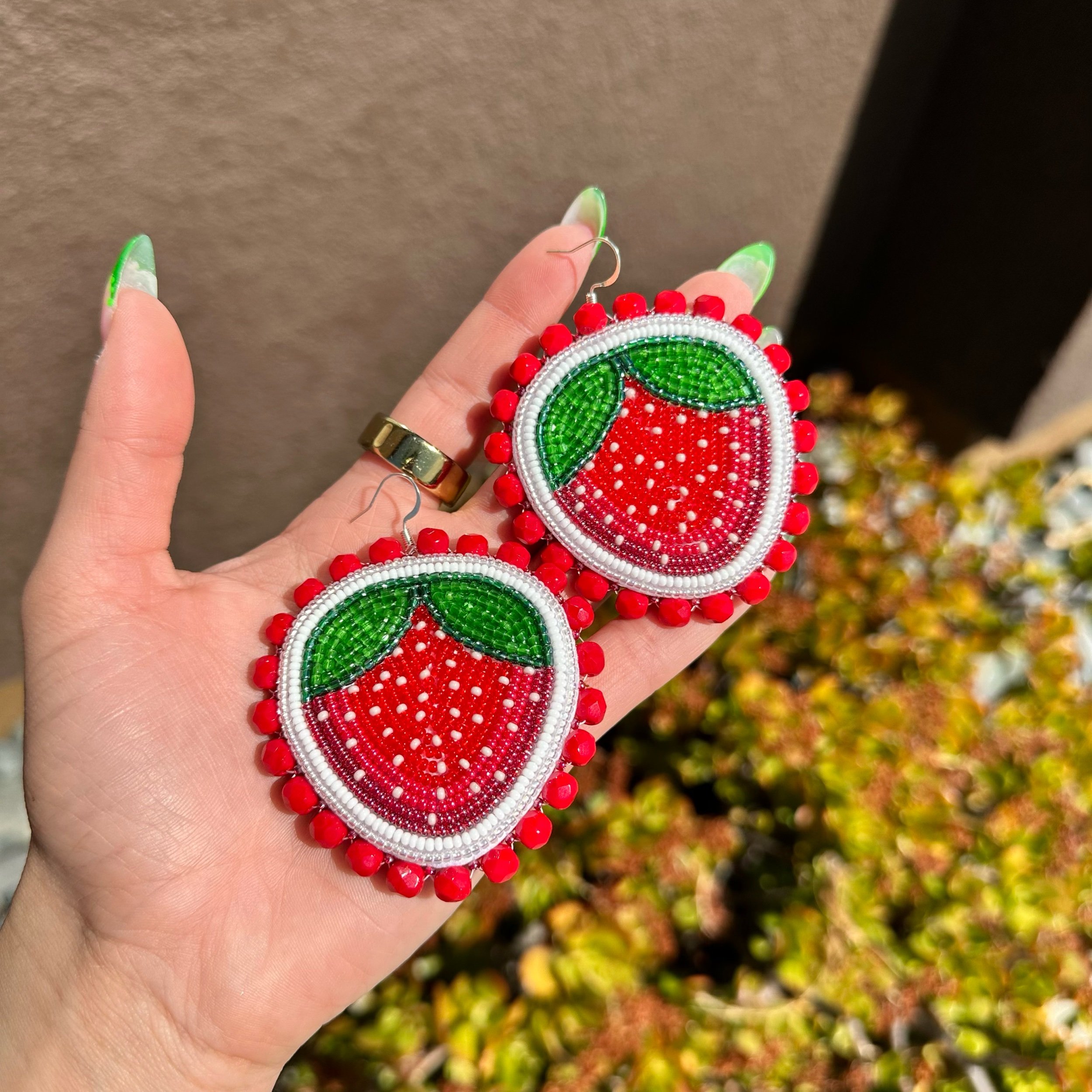 Beaded strawberries with red ombre luster, green ombre satin, white & AB crystal beads. Backed with felt and silver plated earring hooks.